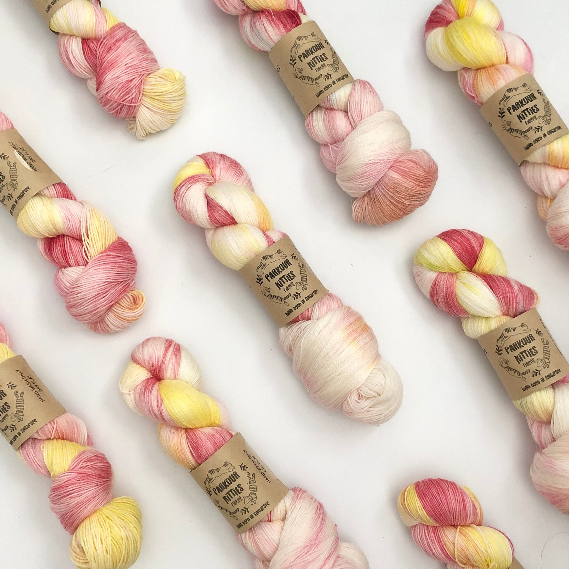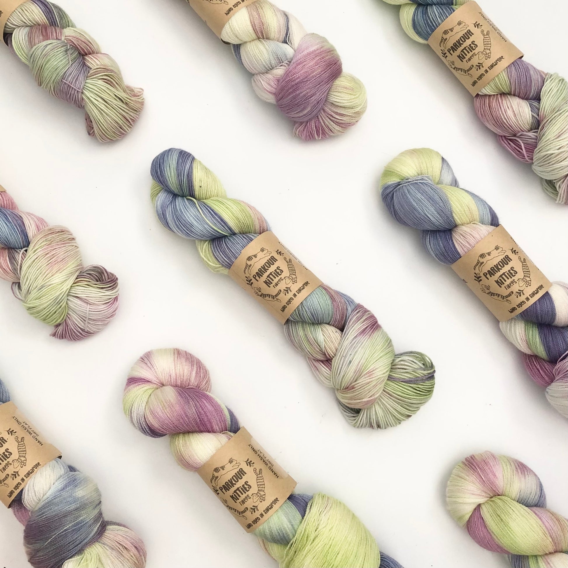 Parkour Kitties Fibers is an independent hand dyed yarn studio based in Singapore, known for creating vibrant, hand-dyed yarns on natural fibers like wool and silk. The yarns are hand dyed in small batches. No two skeins are identical, that’s the beauty of hand dyed yarn.